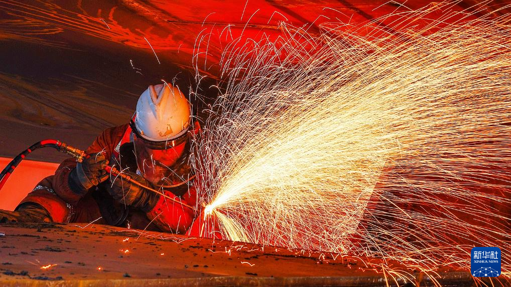 2月13日,工人在作业现场进行气割作业。新华社发(杜鹏辉 摄)