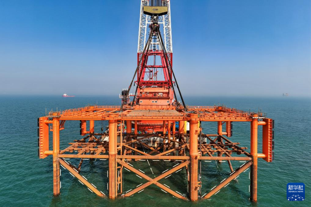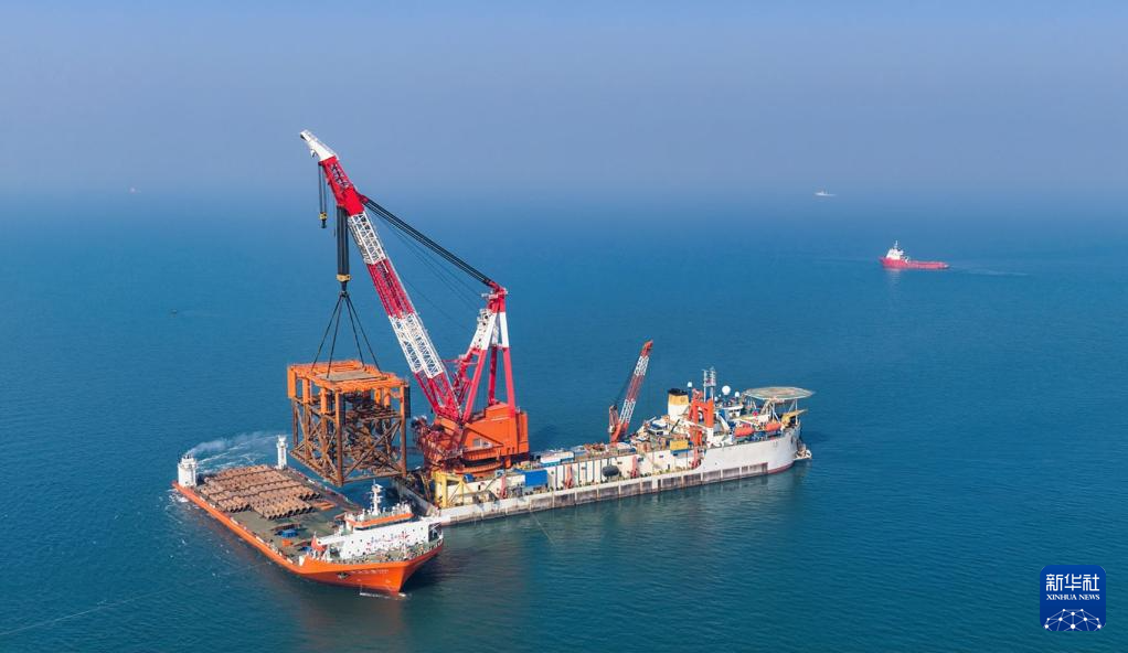 这是2月13日拍摄的渤中26-6油田开发项目(二期)导管架安装现场(无人机照片)。新华社发(杜鹏辉摄)