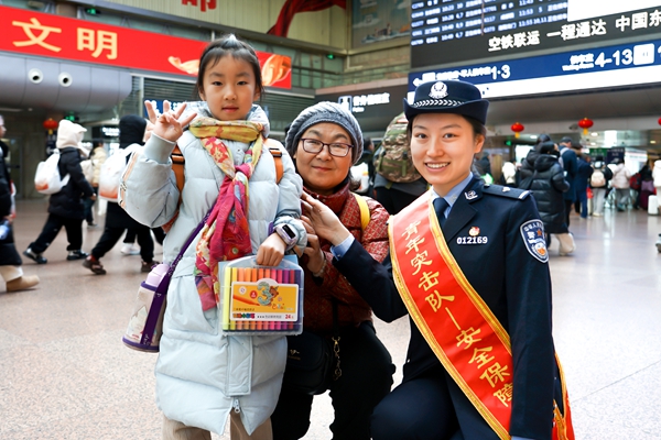 2月2日,正在执勤的北京铁路公安处北京西站派出所民警与旅客合影留念。(北京铁路公安处供图)