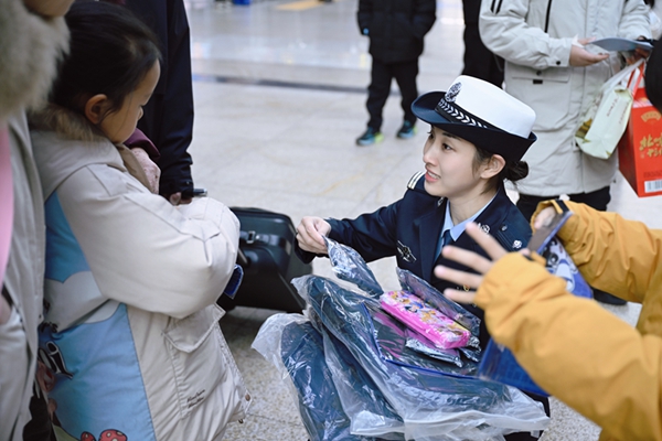 2月2日,北京铁路公安处交通管理支队民警在北京南站开展交通安全宣传活动,向过路群众发放安全知识宣传品。(北京铁路公安处供图)
