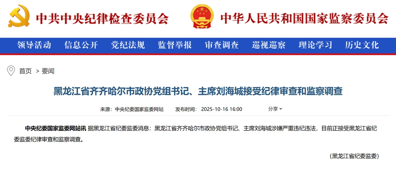 据黑龙江省纪委监委消息:黑龙江省齐齐哈尔市政协党组书记、主席刘海城涉嫌严重违纪违法,目前正接受黑龙江省纪委监委纪律审查和监察调查。